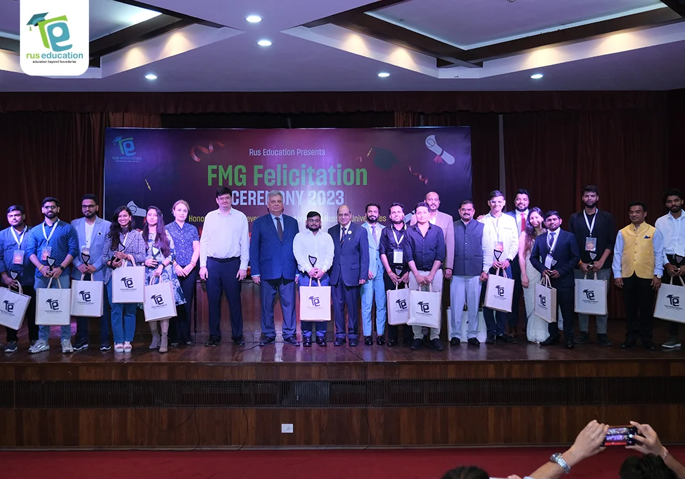 The exceptional eve of 18th March 2023 bore witness to Rus Education welcoming its former students, the new doctors and their proud parents for FMG Felicitation Ceremony 2023 at the Russian House in New Delhi. Joining to congratulate and bless these new doctors were Mr Oleg Osipov, Director & Ms Elena Barman, Head of the Education Department from Russian House in New Delhi, and Mr Viktor Garelikh, Representative of Russian Embassy along with the management of Rus Education- Prof S.K Washim, Chairman, Air Marshal Dr Pawan Kapoor, Vice Chairman and Mr Syed I Rigan, Managing Director.